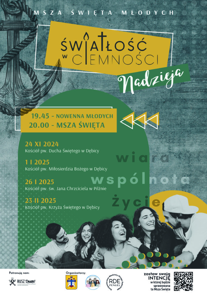 Duszpasterstwo Młodzieży Okręgu Dębickiego zaprasza na Mszę Świętą Młodych z cyklu Światłość w Ciemności w niedzielę 24.11.2024 r. w kościele pw. Ducha Świętego w Dębicy o godz. 20.00 . Msza poprzedzona nowenną Młodych o godz. 19:45 będzie sprawowana w nadesłanych intencjach.