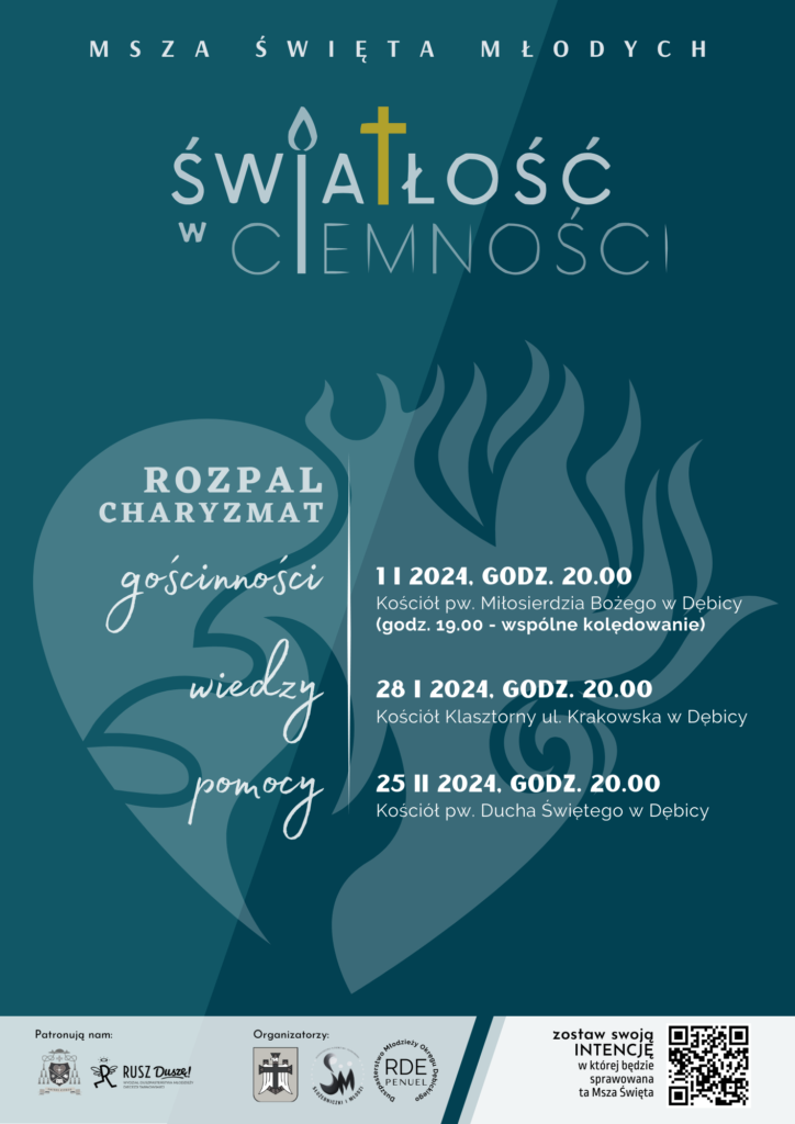 Duszpasterstwo Młodzieży Okręgu Dębickiego zaprasza na Mszę Świętą Młodych z cyklu Światłość w Ciemności (w niedzielę za tydzień – 28.01.2024.r) w kościele Klasztornym w Dębicy, o godz. 20.00 . Msza poprzedzona nowenną Młodych będzie sprawowana w nadesłanych intencjach. Szczegóły na plakatach i mediach społecznościowych RDE PENUEL.