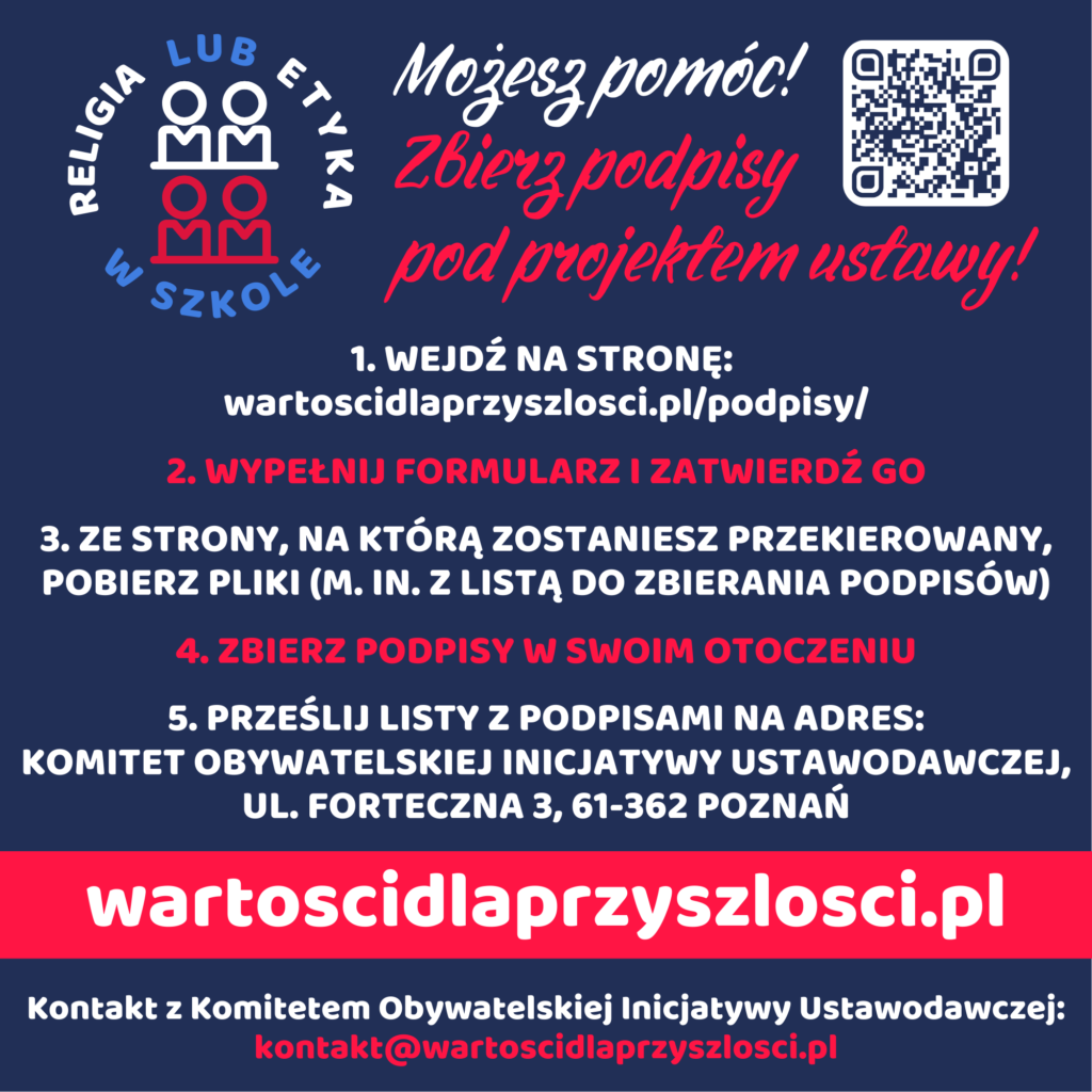 Zachęcamy Was do włączenia się w akcję zbiórki podpisów pod obywatelskim projektem „Ustawy o zmianie ustawy o systemie oświaty oraz ustawy – Prawo oświatowe” wprowadzającej obowiązkowy wybór lekcji religii lub etyki. To wyjątkowa okazja, by wspólnie zadbać o religijne i etyczne wychowanie dzieci i młodzieży w Polsce. Nasze działania mają aprobatę Księży Biskupów, wyrażoną w komunikacie Konferencji Episkopatu Polski z 14 marca 2025 roku, wydanym po 400. Zebraniu Plenarnym: „Biskupi popierają inicjatywę zbierania